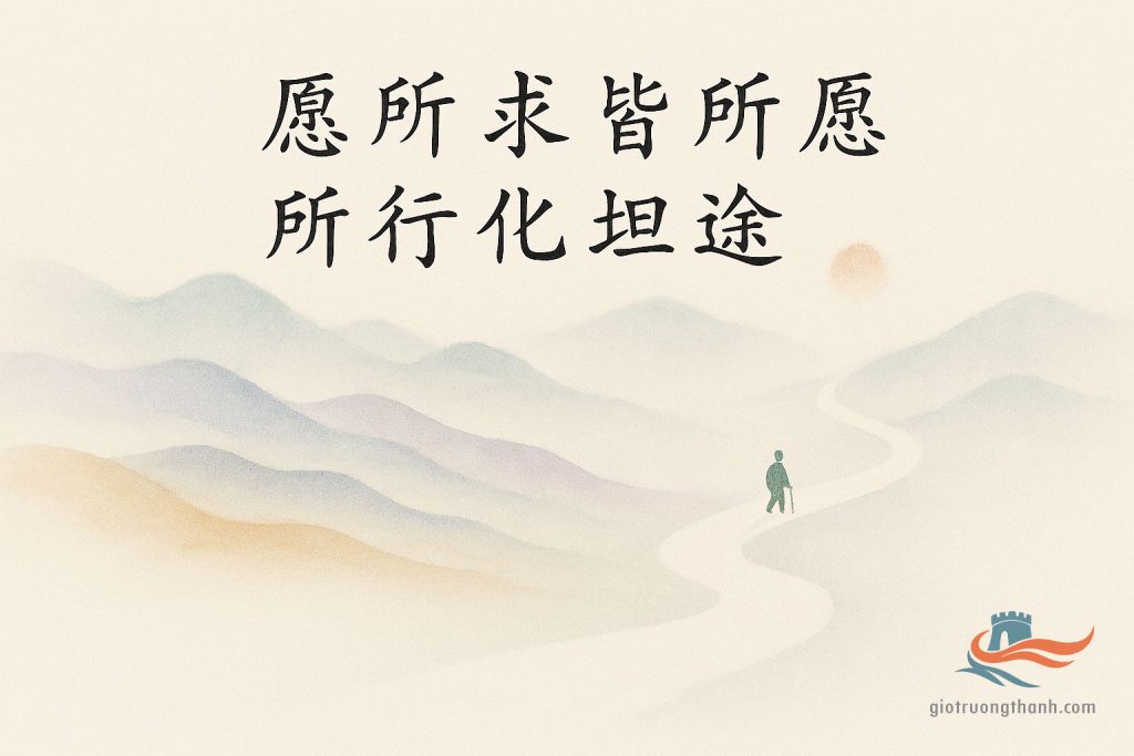 Nghĩa mở rộng: Vạn sự khởi đầu nan, vạn dặm hành trình hóa thênh thang/ Nguyện cho ước nguyện thành tâm, nguyện cho đường đời hóa nẻo bằng.